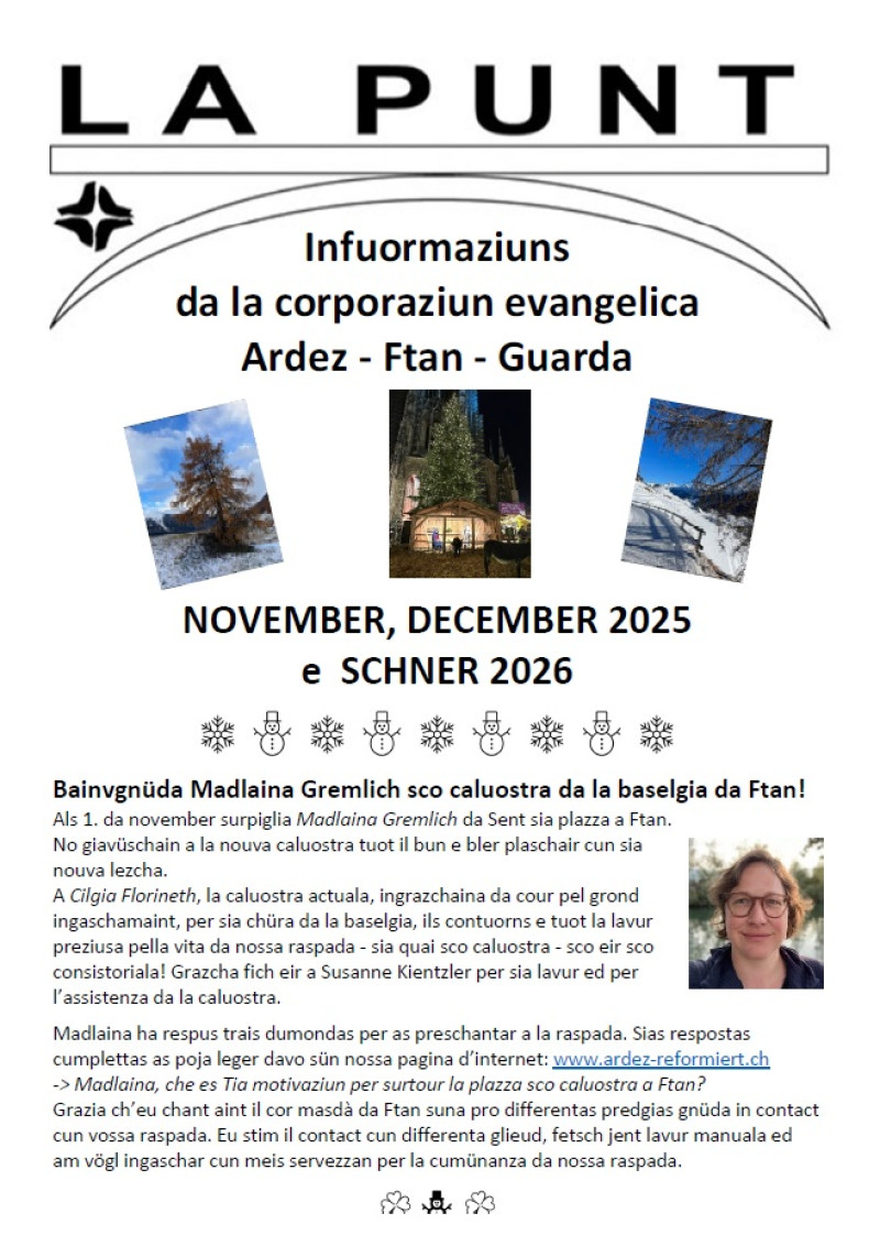 Sie erhalten die "La Punt" direkt in Ihren Briefkasten. In unseren Kirchen liegt sie zum Mitnehmen auf und in dieser Rubrik oder unter "Downloads" können Sie sie runterladen.